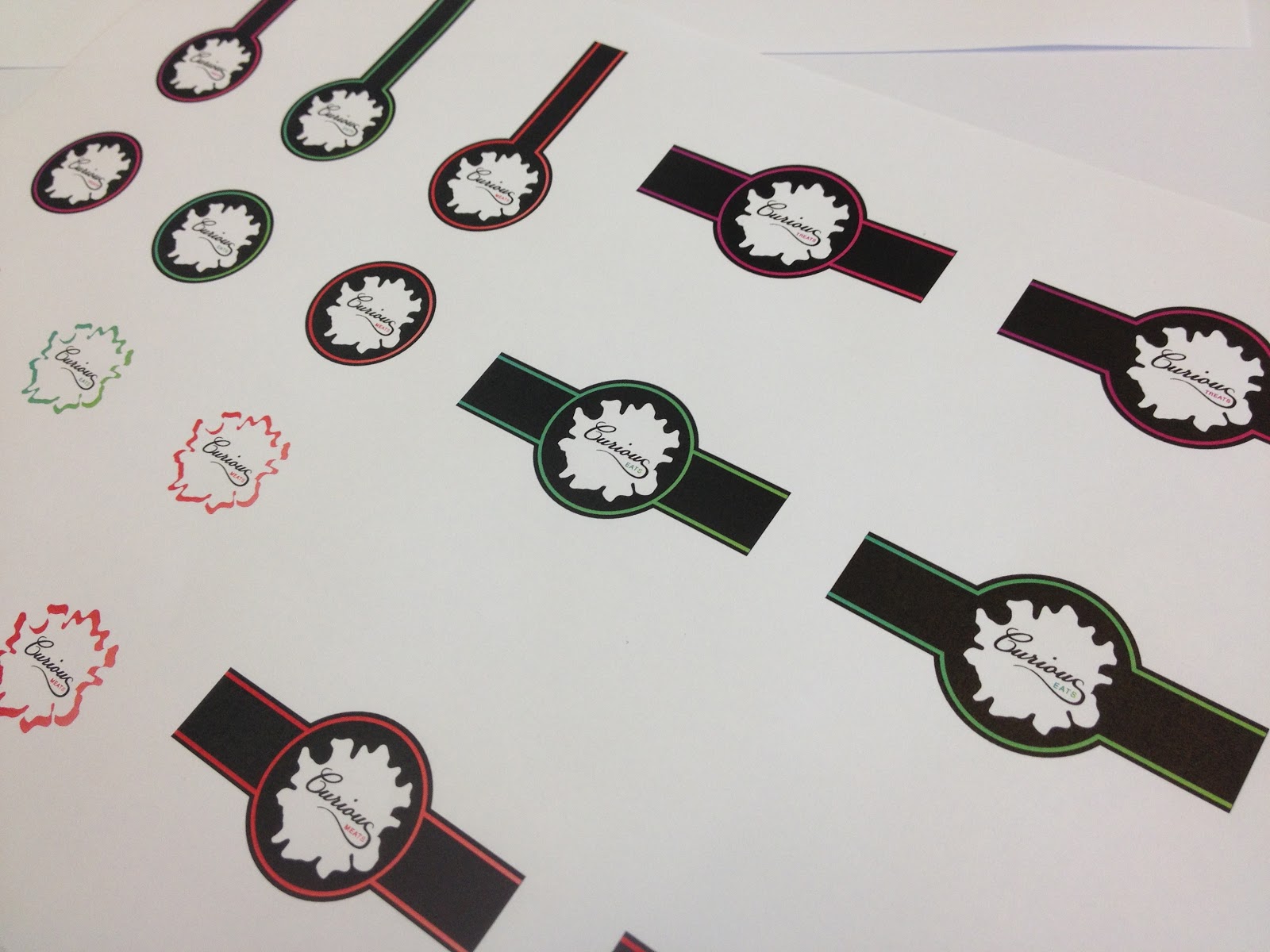 As expected but not anticipated the colours of the gradient have come out a bit darker than they are on screen. On print the there is a smaller difference between the two colours in each of the gradients and the green logo doesn't look as bright as it does on screen. I think I may need to go back and edit the 'meats' logo because when printed out there is little to no difference in the gradient. I also need to find the foils to match these.